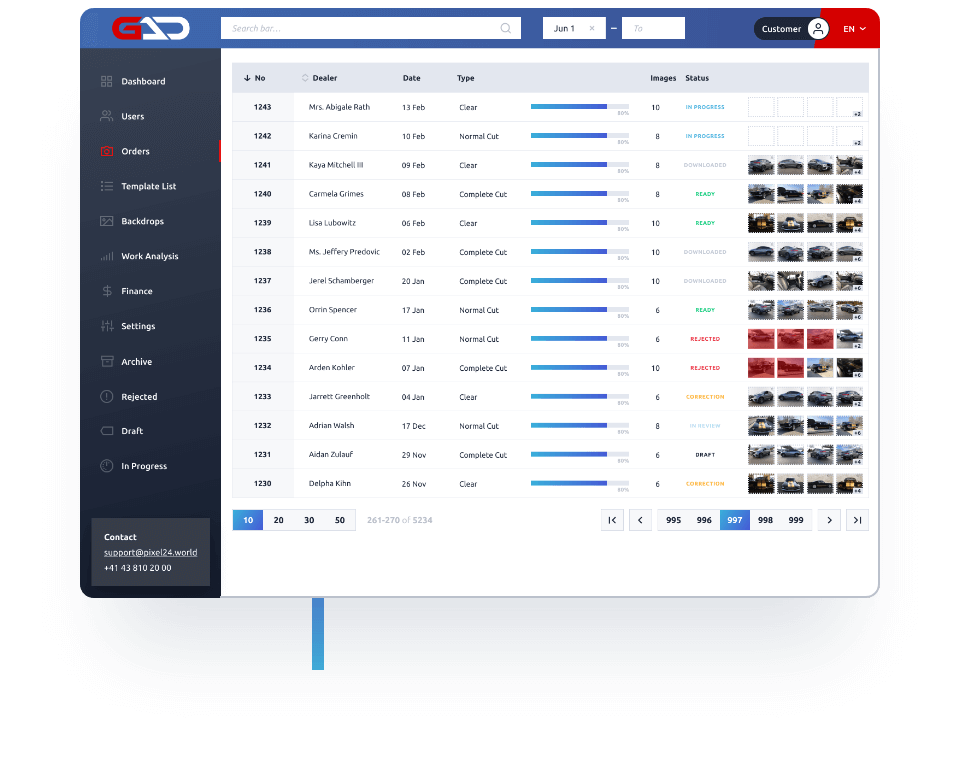 - Nach einer einfachen schnellen und automatisierten Sortierung: Anzahl an Bildern,Bildgrössen können Sie die Bilder zur Bearbeitung direkt im GAD Customer Interface übermitteln.